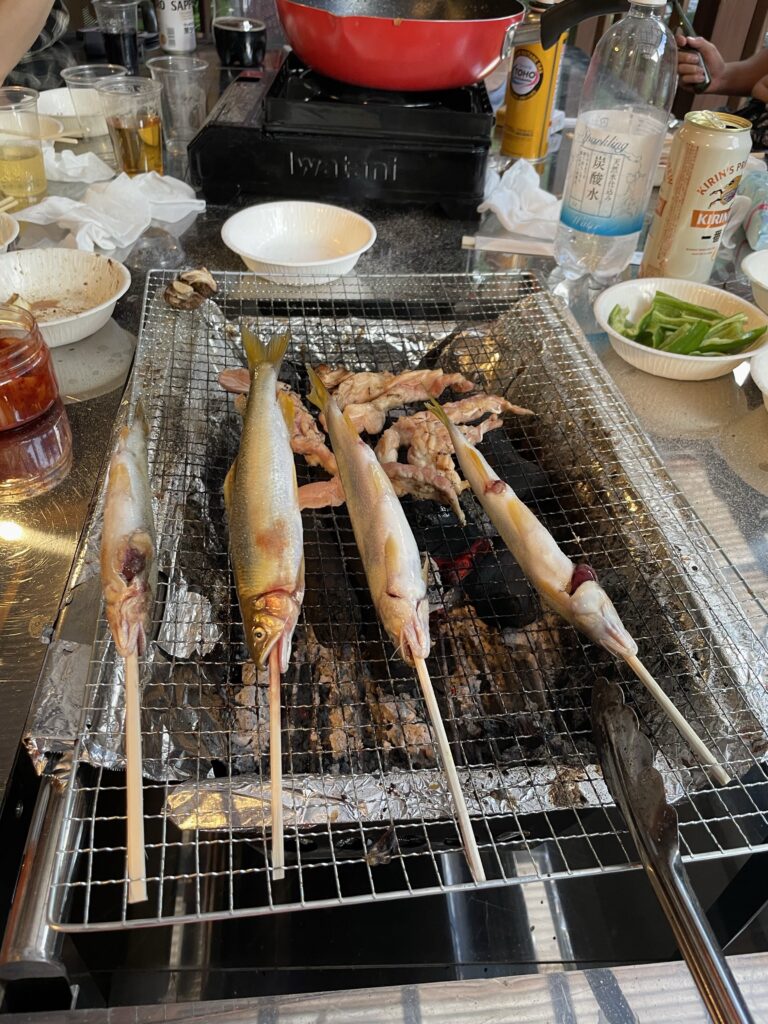 今回のお料理のメインは炭でじっくり焼いた鮎の塩焼き!